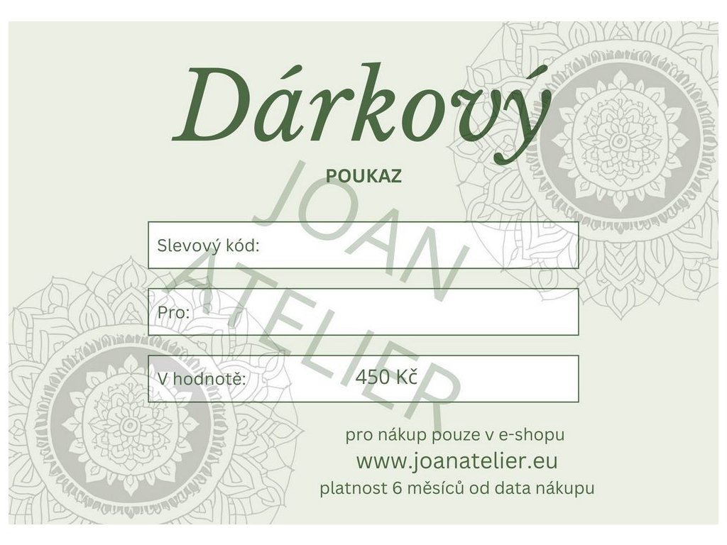 Poukaz platí na všechno zboží v e-shopu www.joanatelier a je platný 6 měsíců od vytvoření a zaplacení objednávky.
