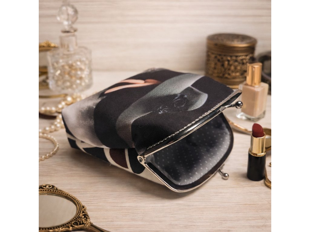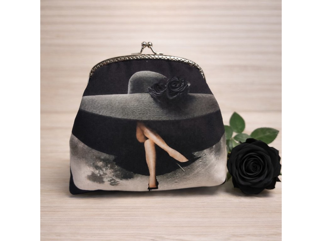 Dominantním prvkem je ručně přišité kovové zapínání – rámeček, které taštičce dodává elegantní vzhled a zajišťuje snadné a bezpečné otevírání.