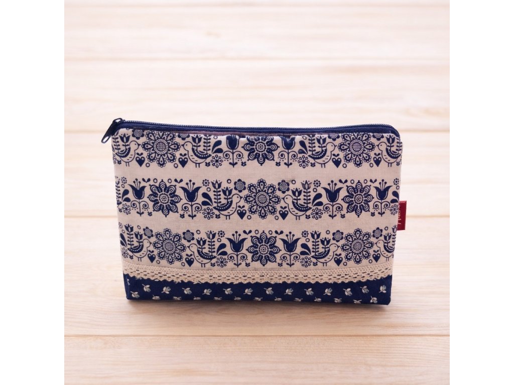 Taštičky jsem ušila ze 100% bavlny s jemnými folklorními vzory v tradiční modrobílé kombinaci.